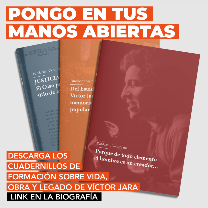 La colección “Pongo en tus manos abiertas” se compone de tres cuadernillos diseñados en un esfuerzo conjunto entre la Fundación Víctor Jara y la Unidad de Memoria y Derechos Humanos del Ministerio de las Culturas, las Artes y el Patrimonio. Cada cuadernillo aborda una temática específica: vida y obra de Víctor Jara; la historia del Estadio Víctor Jara como sitio de memoria y la lucha por la verdad y la justicia vinculada a su asesinato.